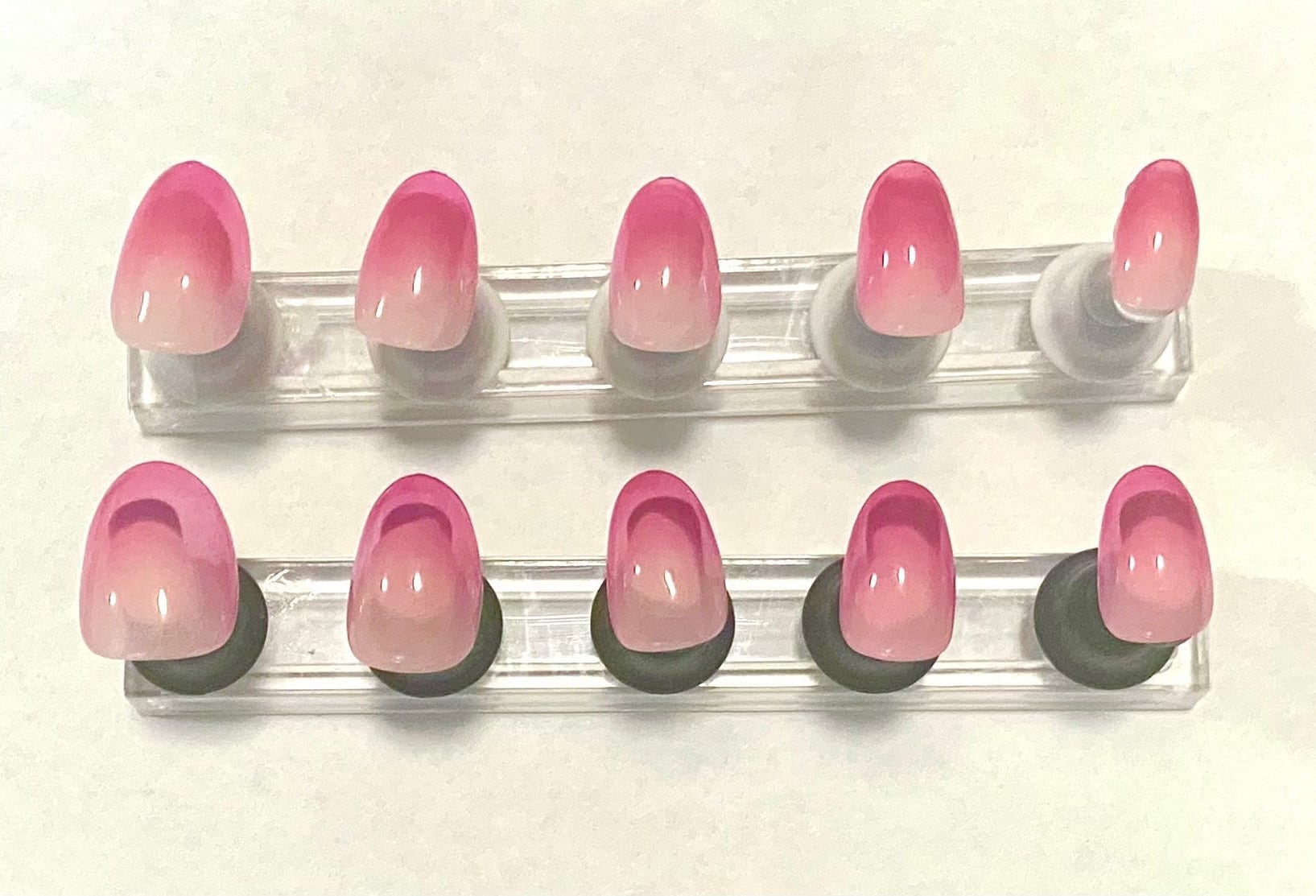 Ombre nails created through many thin layers of polish and eyeshadow for an airbrushed look.